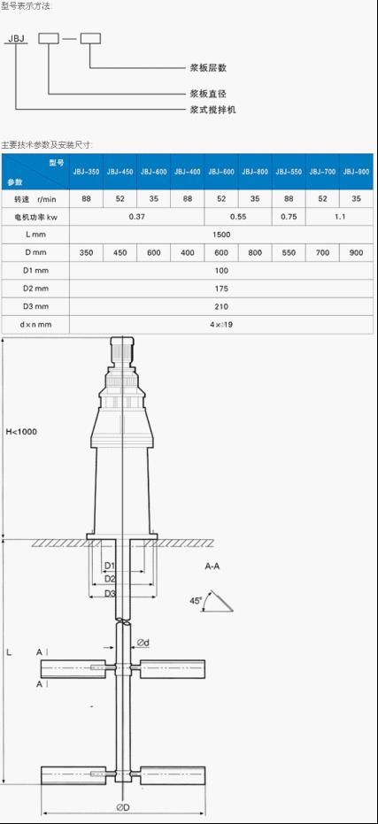 JBJ型槳式攪拌機,有攪拌軸、攪拌槳葉、機座和驅動裝置組成。